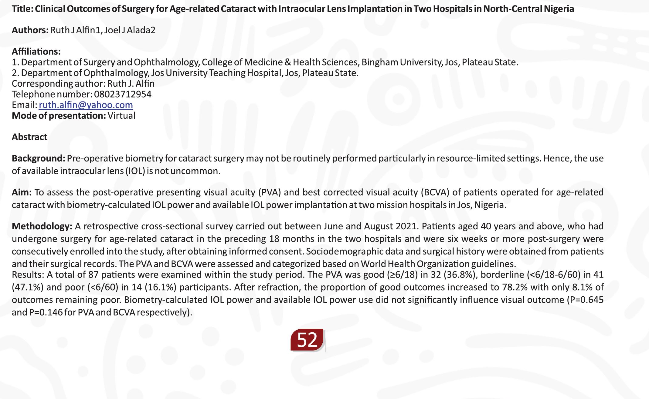 Aim: To assess the post-operative presenting visual acuity (PVA) and best corrected visual acuity (BCVA) of patients operated for age-related cataract with biometry-calculated IOL power and available IOL power implantation at two mission hospitals in Jos, Nigeria.